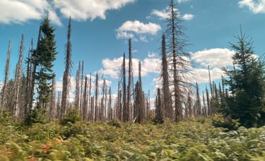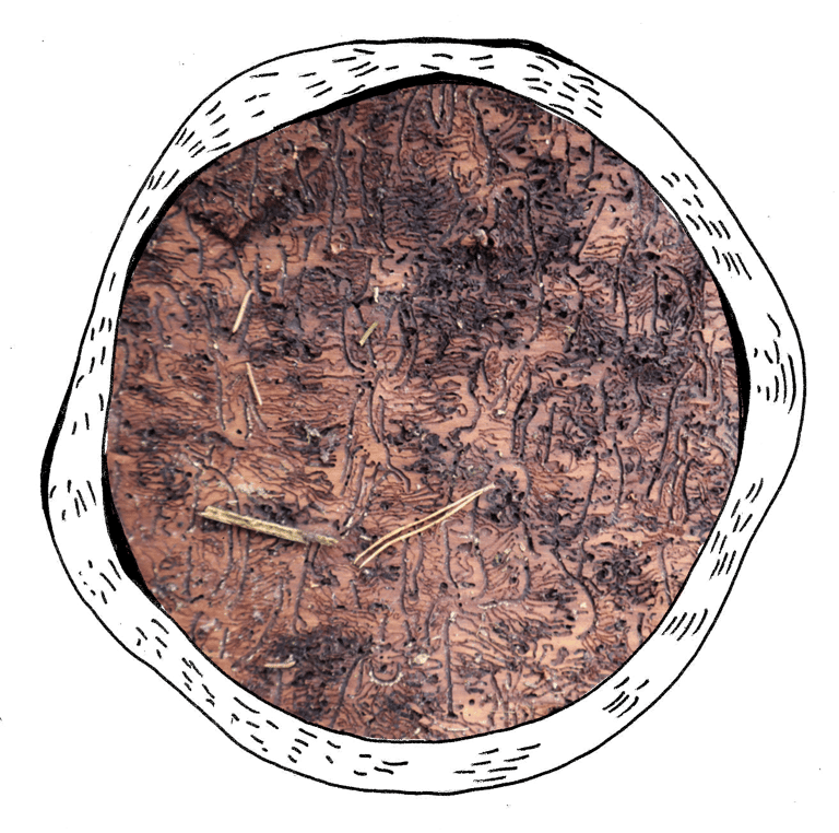 Often, these bark beetle populations can wipe out entire monocultural sites of pine trees, leaving behind a field of dead wood: thin pine sticks bobbing in weak breezes of hot summer standstill. This is the moment in which the trees are reduced to their economic capacity as firewood, extracted from the rest of their life cycle. But for us, this moment of perceptual standstill allows us to pause and navigate through worlding and storytelling somewhere other than in a sawmill or on a forest owner’s bank account.