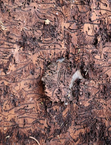 These visible deadly wounds on the inner bark of the locally, monoculturally planted pine trees prove that the European spruce bark beetle (Ips typographus) has used trees weakened by recent climatic conditions as breeding centres.